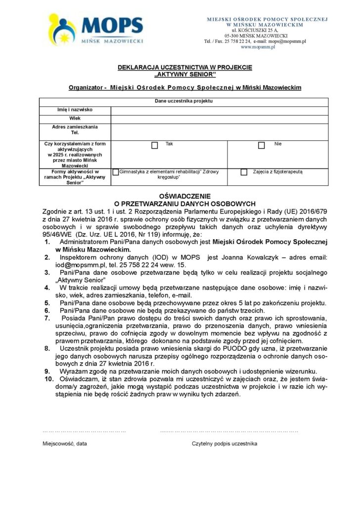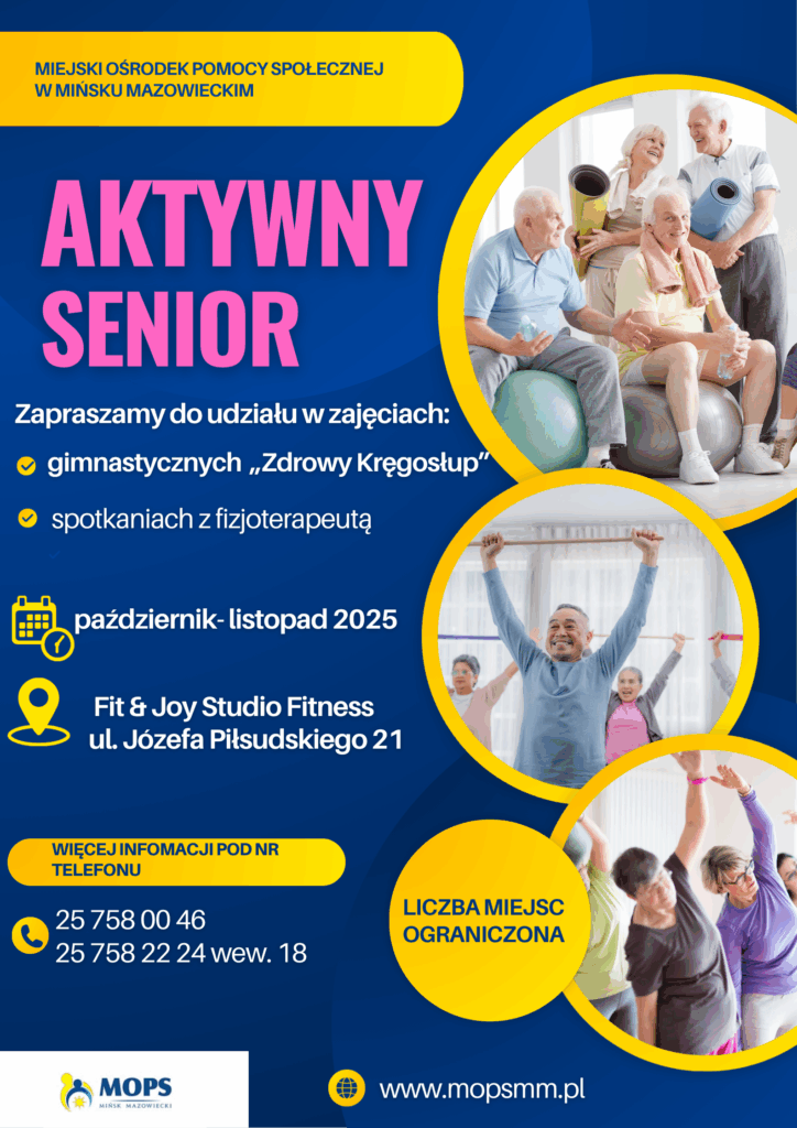 Zapraszamy Seniorów z naszego miasta do udziału w projekcie „Aktywny Senior”, którego celem jest wzmacnianie zdrowia, sprawności i dobrego samopoczucia osób starszych. Wspólnie pokażemy, że aktywność fizyczna to najlepszy sposób na długie, pełne energii życie!