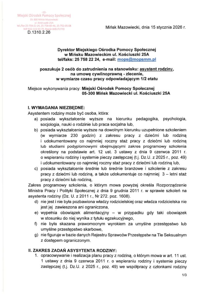 Nabór dwóch osób na stanowisko asystent rodziny