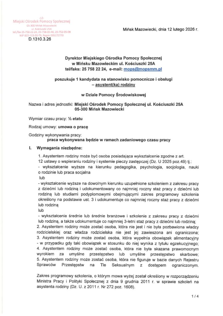Nabór osoby na stanowisko pomocnicze i obsługi asystent(ka) rodziny